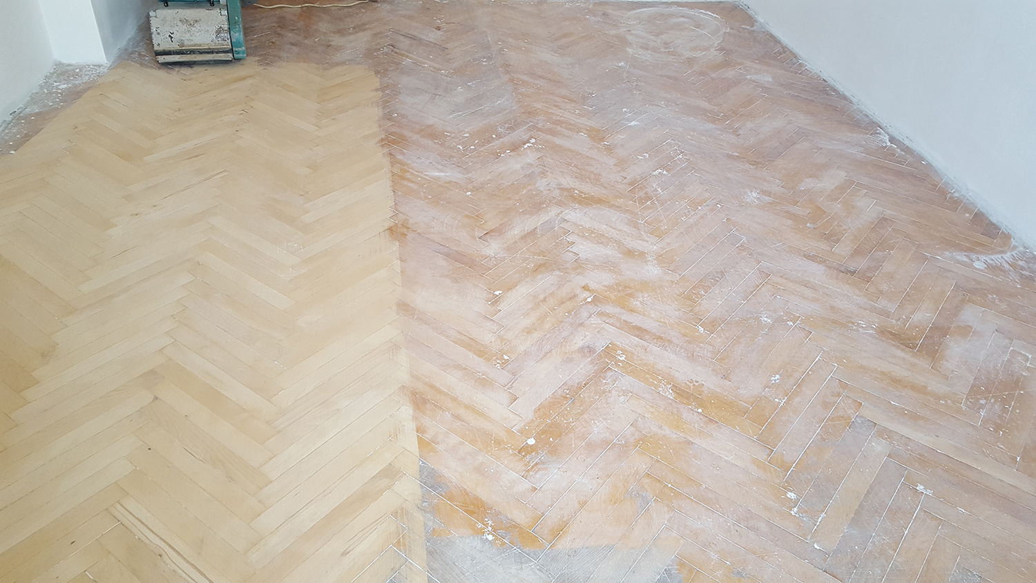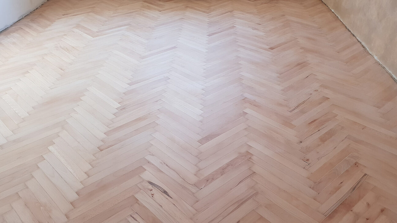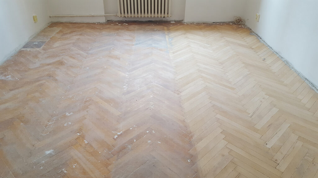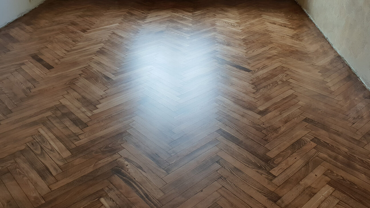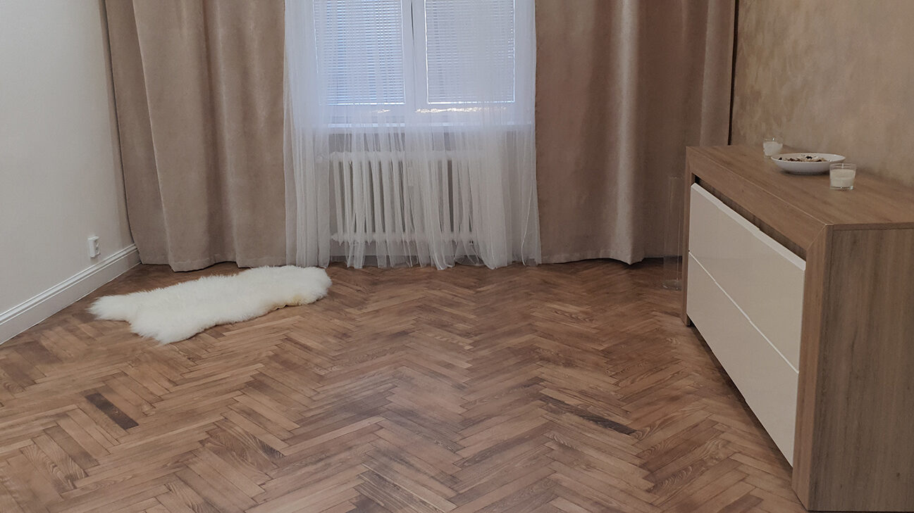 Renovace parketové podlahy. Požadavkem zákazníka bylo zabarvit podlahu do „tmavší“ barvy a proto jsme volili jako první vrstvu tónovací olej „wild hazel“ + vodní lak v matném provedení. Tónovací olej dodal podlaze moderní vzhled spolu s vysokými bílými lištami.